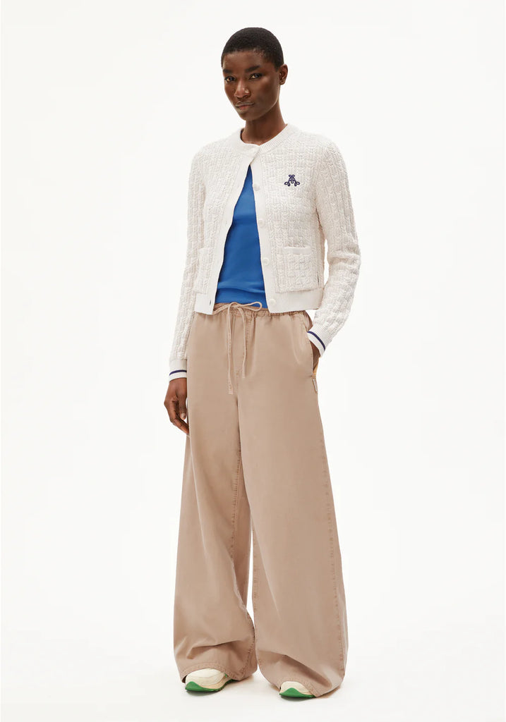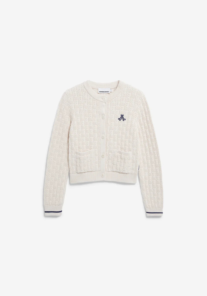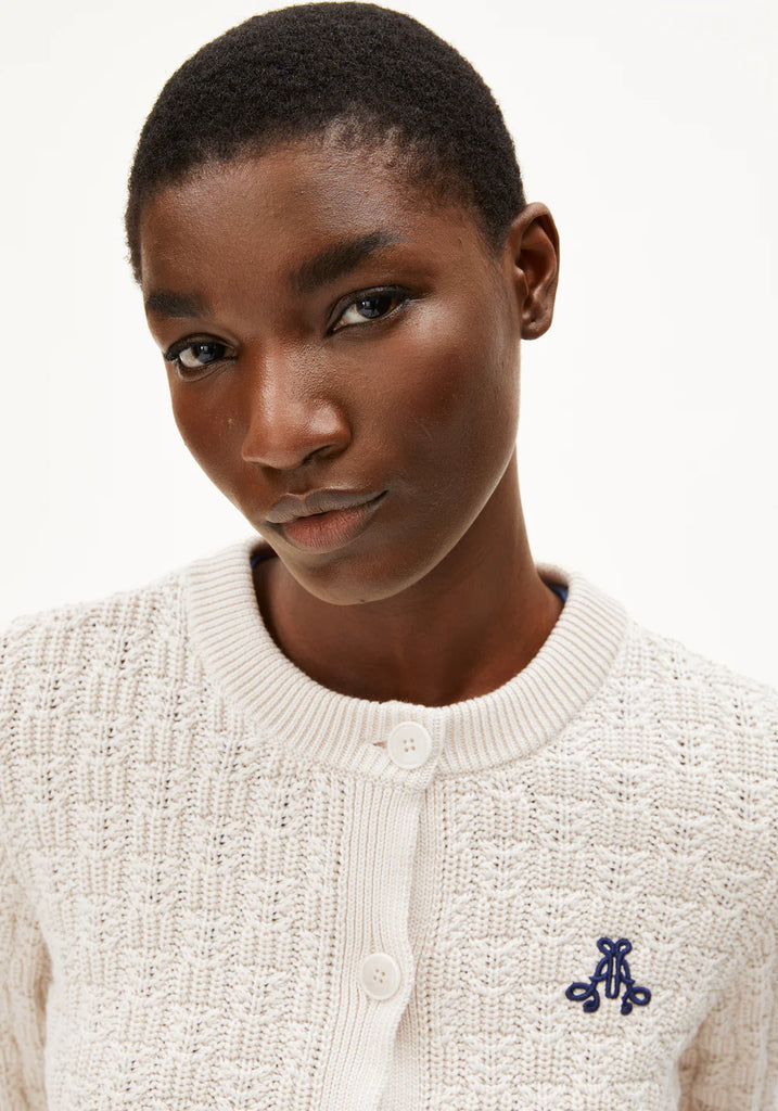 Die Strickjacke von Armedangels ist dein perfekter Layer für Übergangszeiten. Gefertigt aus 100 % Bio-Baumwolle mit feiner Waffelstruktur sitzt sie körpernah und kürzer geschnitten – ideal unter Jacken oder solo über T-Shirts. Der Rundhalsausschnitt und die Knopfleiste geben dir ein cleanes Finish, kleine Stickerei als Detail macht den Look besonders. Vegan, GOTS‑zertifiziert und angenehm leicht – diese Cardigan begleitet dich stilsicher durch viele Tage.