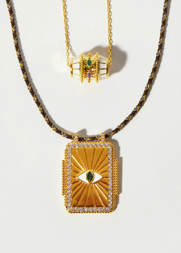 Das Collier Eye Bohème von MYA—BAY ist mehr als ein Schmuckstück. Vergoldet mit 24 Karat Feingold und liebevoll im Atelier handgezeichnet, strahlt es zeitlose Eleganz und Symbolkraft aus. Im Zentrum prangt ein weisses Auge mit einem funkelnden Stein, inspiriert vom antiken Griechenland und ein Zeichen für Hoffnung, Schutz und positive Energie. Ob solo getragen oder als Teil Deiner Schmuck-Layering-Story, verleiht es jedem Look einen Hauch Bohème, Persönlichkeit und kleine Glücksmomente.
