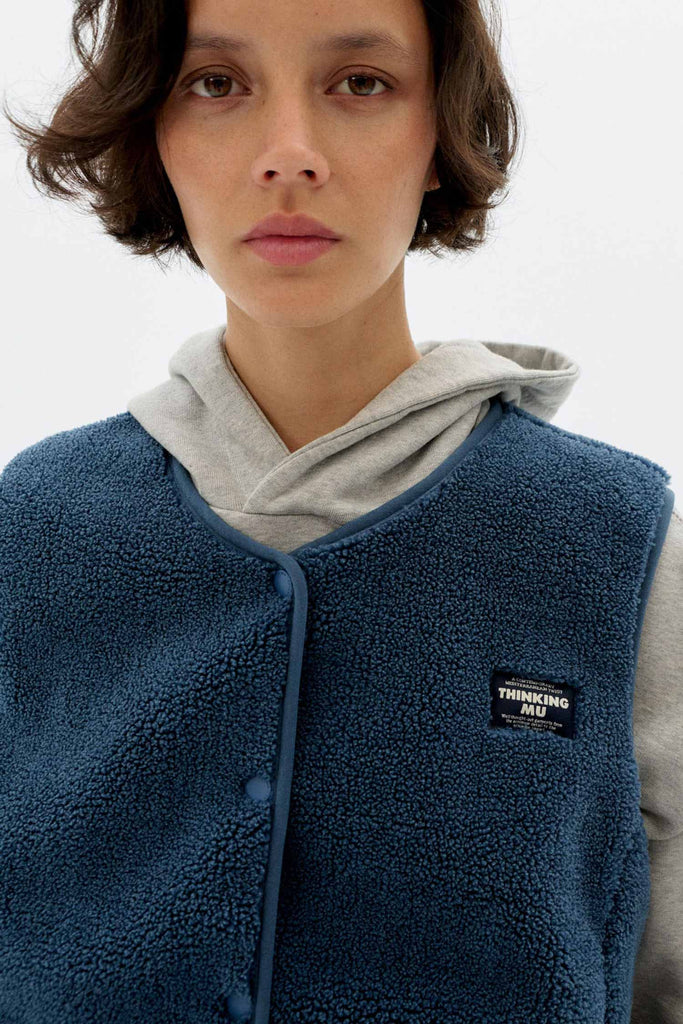 Dein Layer, wenn du Wärme willst ohne aufzutragen. Diese Weste von Thinking Mu bringt’s: Recyceltes Polyester, flauschiges Fleece, dick genug, um richtig zu schützen, aber so relaxed geschnitten, dass sie nicht einengt. Der Rundhals, die Druckknopfleiste vorne und die seitlichen Taschen geben Funktion und Stil zugleich. Perfekt über einem Rollkragen, unter einer Jacke oder einfach solo über ein Shirt. Ob drinnen oder draussen, sie hebt deinen Look und spart dir das Frieren. Bestimmt ein Teil, auf das du öfter zurückgreifst.