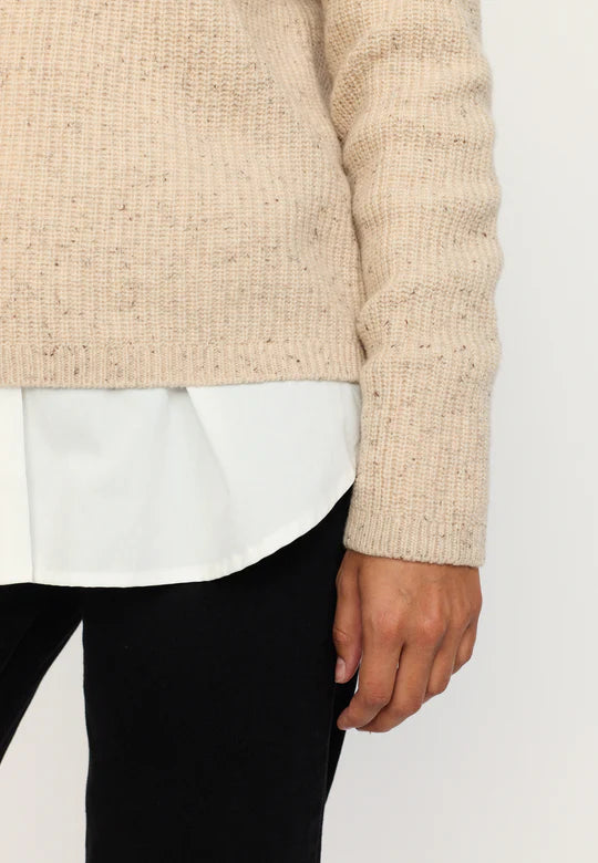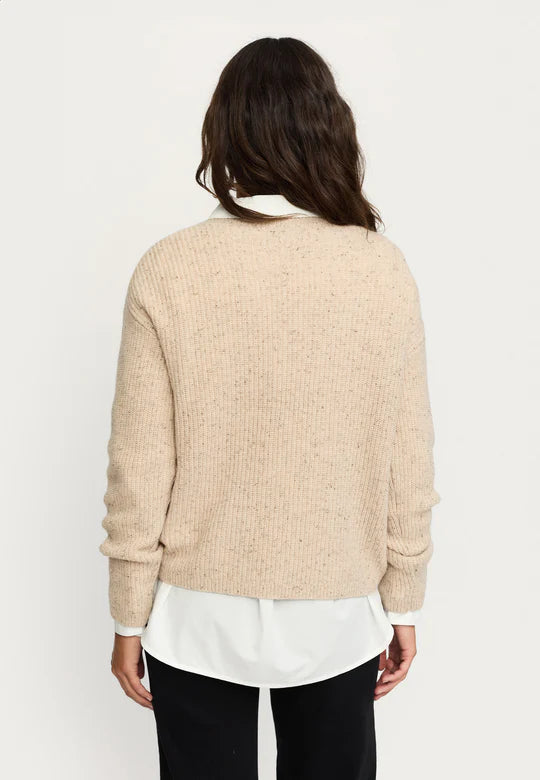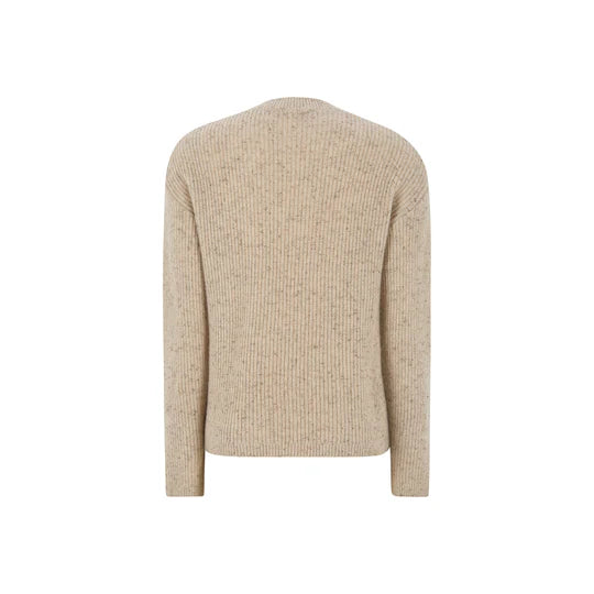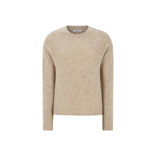 Dieser Strickpullover von Soft Rebels aus 70% RWS-zertifizierter Wolle und 30% Nylon ist nicht nur angenehm zu tragen, sondern auch nachhaltig produziert. Die melierte Farbe „Nomad“ wirkt zeitlos und lässt sich mühelos kombinieren. Ob zu Jeans, Röcken oder unter einem Blazer – dieser Pullover passt immer. Die lockere Passform sorgt für Komfort, während die feine Strickstruktur dem Ganzen eine elegante Note verleiht. Ein echtes Basic, das in keinem Kleiderschrank fehlen sollte.