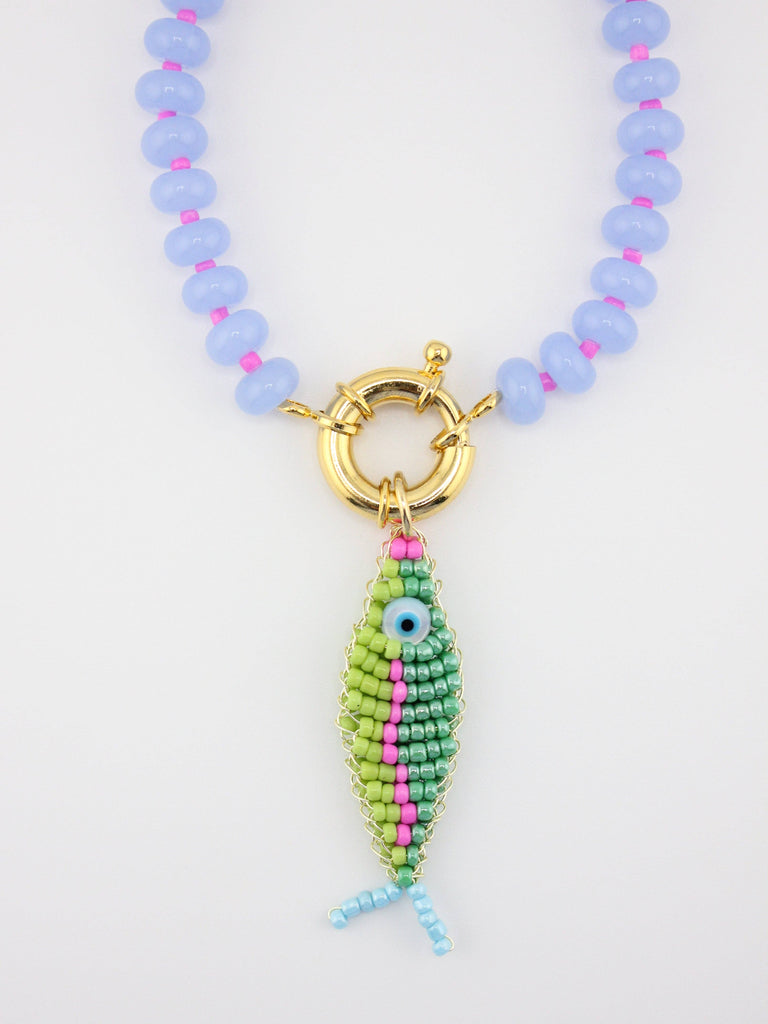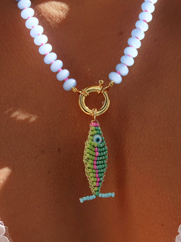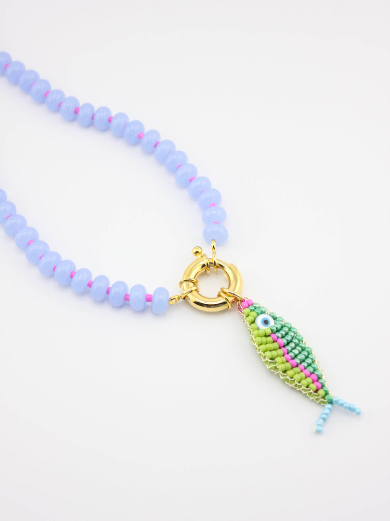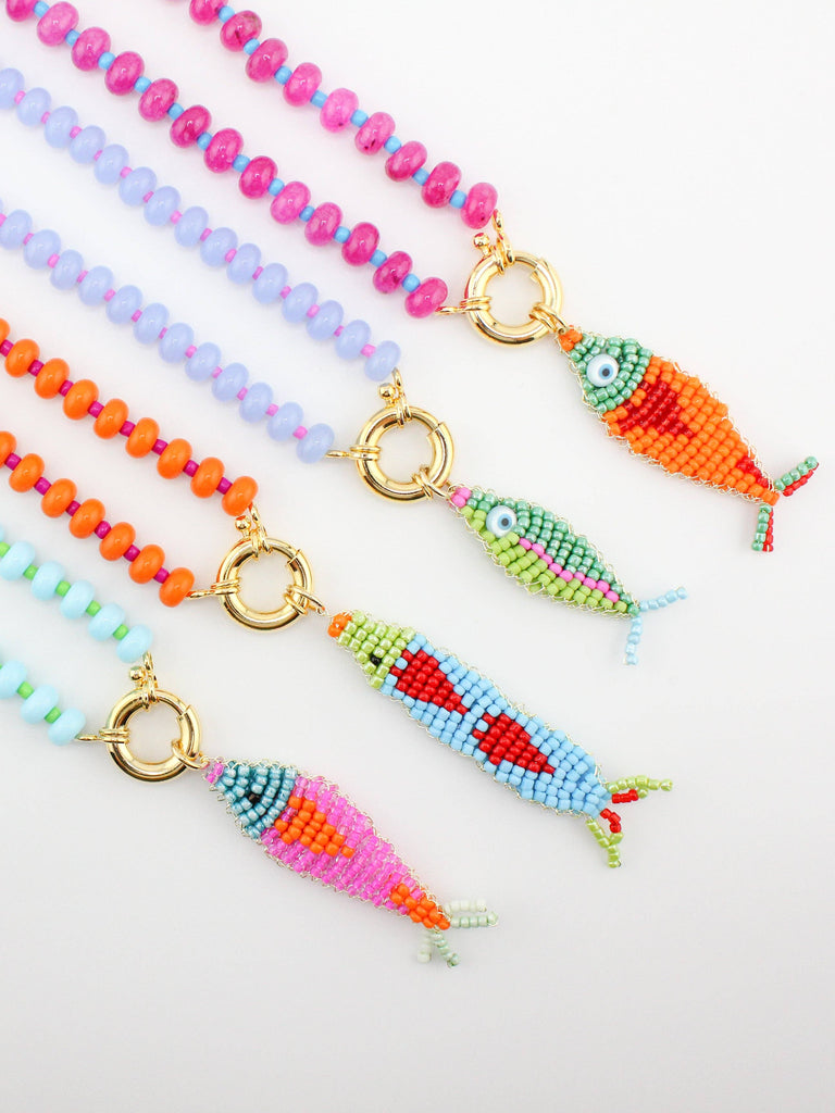 Die Pez del Sol Halsketten von unserem neuen Brand Cara O Sello sind dein perfekter Begleiter für den Sommer. Hergestellt aus leuchtenden Glasperlen und einem handgefertigten Fischanhänger bringen sie das Gefühl von sonnenverwöhnten Tagen, Küsten und Spass direkt zu dir. Der goldene Knebelverschluss verleiht der Kette Wertigkeit und der Talismann steht dir beschützend zur Seite. Wähle aus vier Farben, inspiriert von tropischen Inseln, goldenen Sonnenstunden, Festivals und bunten Lagunen. Trage sie solo für einen coolen Look oder kombiniere sie mit deinen Strandoutfits – perfekt für den Sommer!