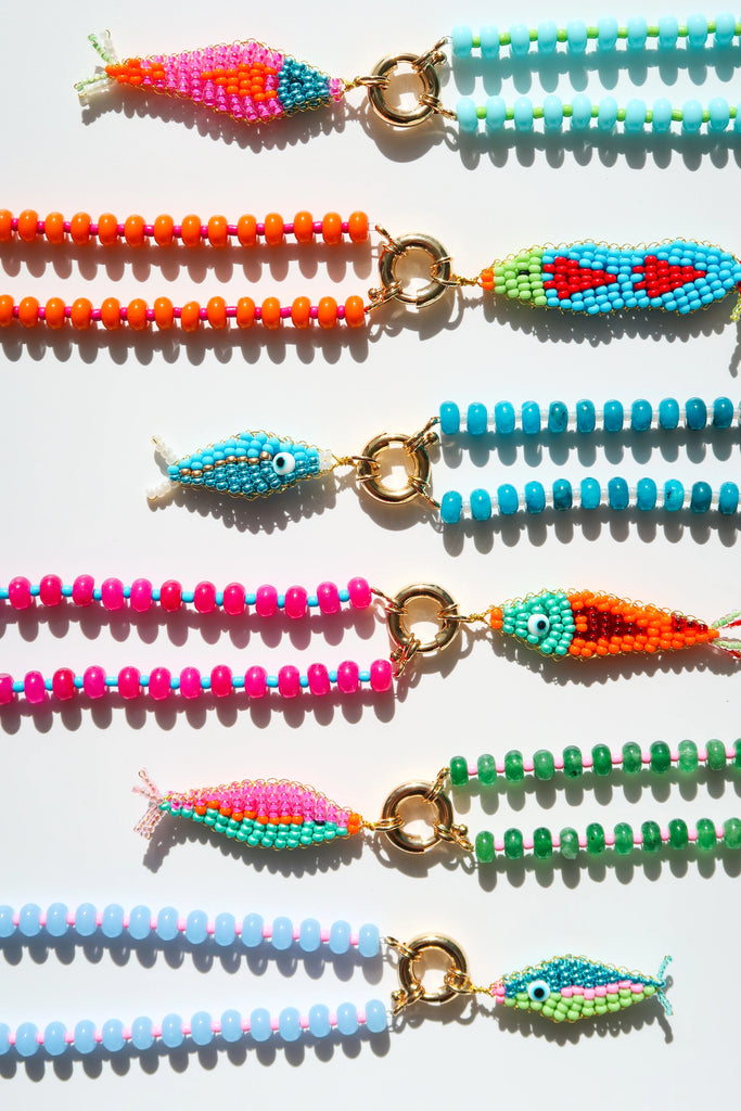 Die Pez del Sol Halsketten von unserem neuen Brand Cara O Sello sind dein perfekter Begleiter für den Sommer. Hergestellt aus leuchtenden Glasperlen und einem handgefertigten Fischanhänger bringen sie das Gefühl von sonnenverwöhnten Tagen, Küsten und Spass direkt zu dir. Der goldene Knebelverschluss verleiht der Kette Wertigkeit und der Talismann steht dir beschützend zur Seite. Wähle aus vier Farben, inspiriert von tropischen Inseln, goldenen Sonnenstunden, Festivals und bunten Lagunen. Trage sie solo für einen coolen Look oder kombiniere sie mit deinen Strandoutfits – perfekt für den Sommer!