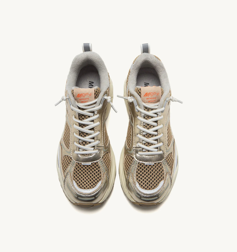 Der Melrose Sneaker von MRP bringt Glam und Streetwear auf den Punkt. champagnerfarbene Töne verschmelzen zu einem Look, der auffällt, ohne laut zu sein. Hochwertiges laminiertes Leder trifft auf atmungsaktives Mesh – leicht, bequem und ready für jeden Tag. Die mehrfarbige Sohle sorgt für Dynamik und federnden Komfort bei jedem Schritt. Ob Jeans, Kleid oder Joggers – dieser Sneaker passt einfach immer. Designed to move, made to shine.